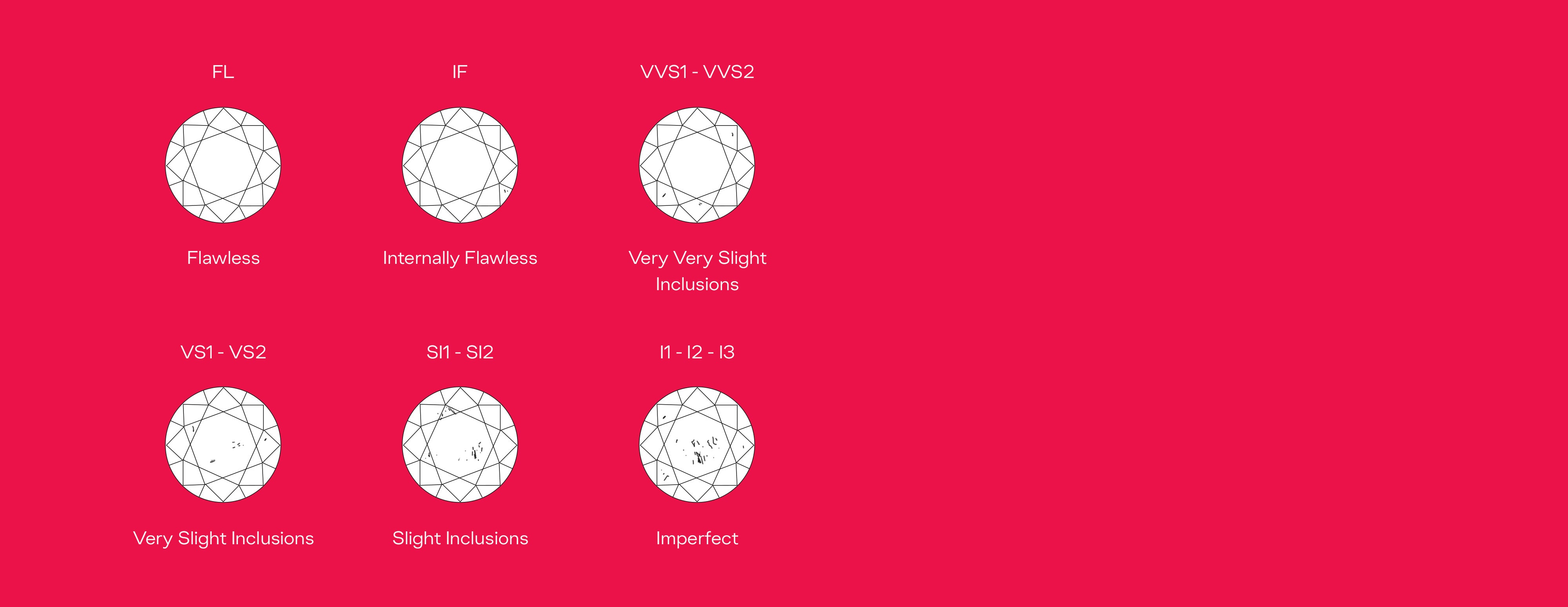 A diamond’s Clarity grade is based on the number, size, and location of the imperfections that naturally occur in a diamond. Most imperfections tend to be microscopic and generally do not affect the overall beauty of a stone. These inclusions are natural identifying marks that occur during the diamond formation process. Clarity is graded on a scale ranging from Flawless to Included, and the visibility of the imperfections are graded under 10x magnification.