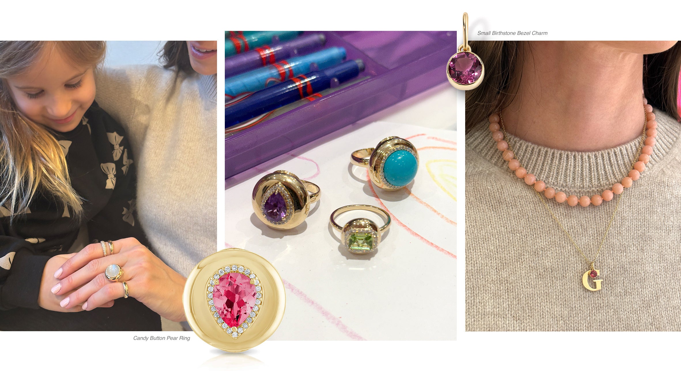 Birthstone jewelry is a timeless gift—an elegant way to celebrate each child and grandchild. Personally, I’m loving the new charms; they pair beautifully with our delicate initial pendants. Our Candy Button ring is another fun way to incorporate a birthstone.